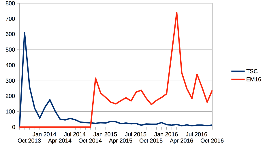 Those curves are pretty interesting, though. TSC has what I understand is a pretty typical sales curve (the second peak is when the scenario editor was announced, and also mostly happened before an announced price increase went into effect). EM16 is something else, though. EM16 sales have been (relatively speaking) steady — it had a few peaks but it never exactly took fire. Maybe that's because it got zero coverage and all of the sales are organic. And the peaks aren't quite what I expected: the first peak was during the primaries (that much makes sense). The second was during the party conventions but (unexpectedly to me) was much smaller. There seems to barely be a peak at all for the election itself and I really didn't expect that — I expected the strongest sales would be right now, but they're not. Maybe because this election is awful and everyone who cares about elections is sad. I do expect sales will trail off after this month, but probably slowly (judging by the rest of the sales curve). I've been terrible at sales predictions so far, though.